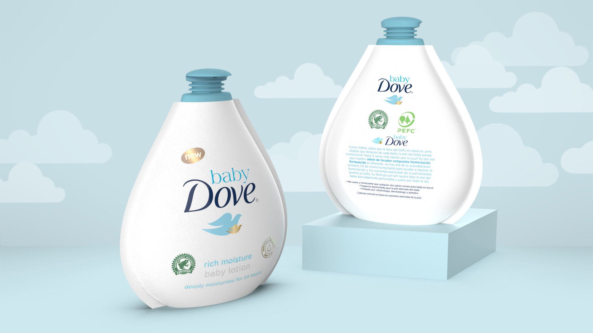 Plastic packaging is an ever increasing problem and the issues around sustainability, climate change and the rapid change in legislation inspired this exploratory concept for Baby dove, propelling the brand to not just being gentle for the skin but for the earth.